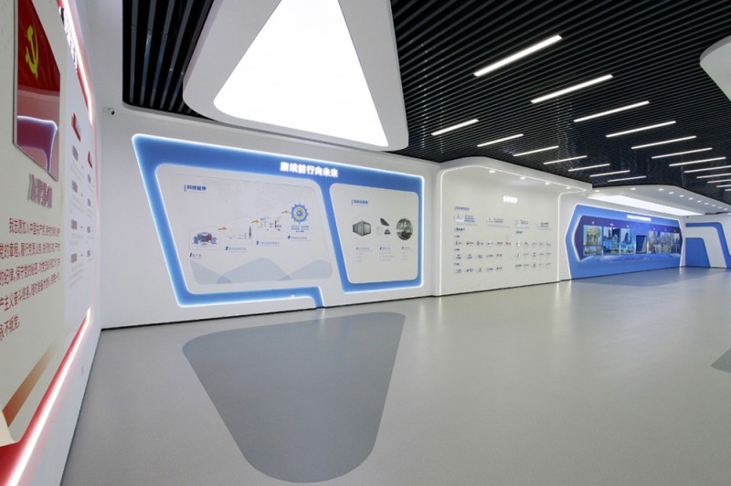 頂和地面造型統(tǒng)一,白色吊頂和灰色橡膠地面,黑色方鋼吊頂和灰色橡膠地面相互呼應(yīng),統(tǒng)一中富有變化,變化中又蘊(yùn)含統(tǒng)一,使整個展廳科技意境深遠(yuǎn)悠長。