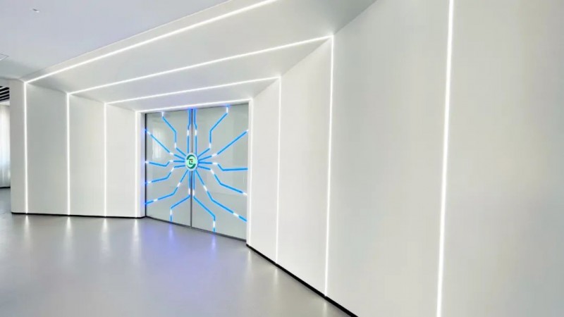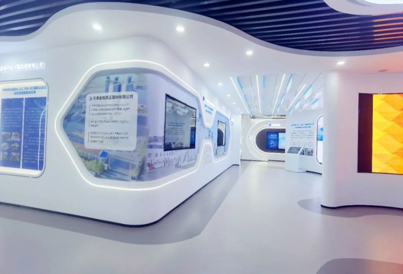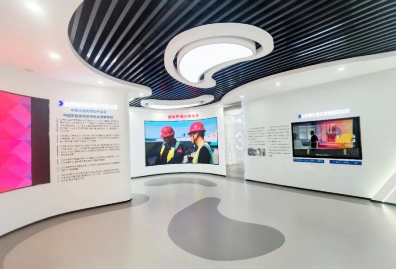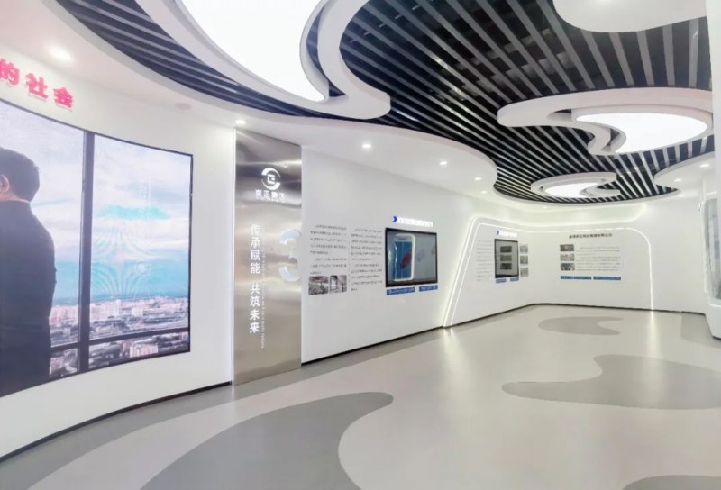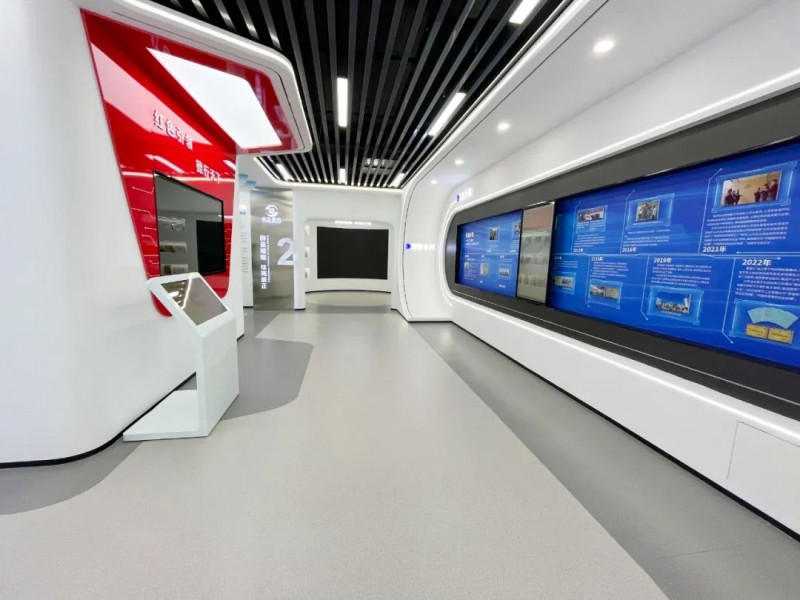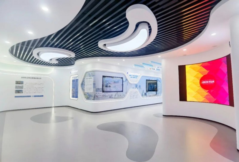 展廳中多處運用電子互動大屏放映企業(yè)專題片,并且將展廳墻體直角部分改為弧形,與曲面屏呼應(yīng)的同時增強了空間的整體流動性。展廳運用統(tǒng)一基礎(chǔ)標準色調(diào),使得整個展廳風格更加統(tǒng)一。在頂部運用線性燈與筒燈進行融合照明,提升視覺美感。