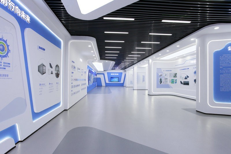 頂和地面造型統(tǒng)一,白色吊頂和灰色橡膠地面,黑色方鋼吊頂和灰色橡膠地面相互呼應(yīng),統(tǒng)一中富有變化,變化中又蘊(yùn)含統(tǒng)一,使整個(gè)展廳科技意境深遠(yuǎn)悠長(zhǎng)。