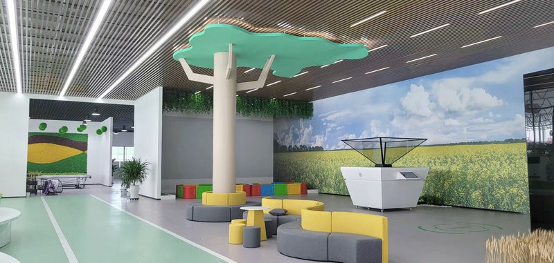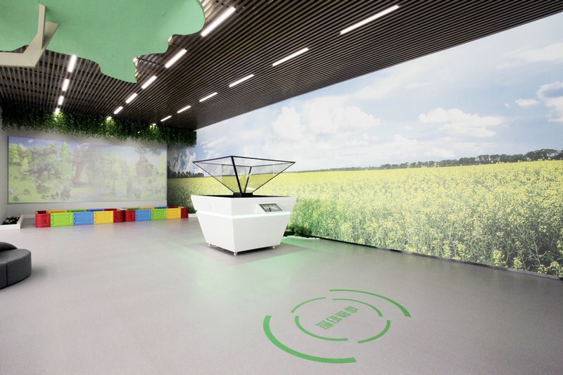 在突出數(shù)字農(nóng)業(yè)展廳科技氛圍的基礎(chǔ)上,也要凸顯農(nóng)業(yè)的生態(tài)和諧之美。所以,在色彩、形式、功能上合理搭配,用場(chǎng)景還原的方式營(yíng)造真實(shí)的農(nóng)業(yè)場(chǎng)景,讓參觀者身臨其境去體驗(yàn)。用代表綠色生態(tài)的配色來升華成展廳的主色調(diào),用數(shù)字展示技術(shù)展示農(nóng)業(yè)內(nèi)容。